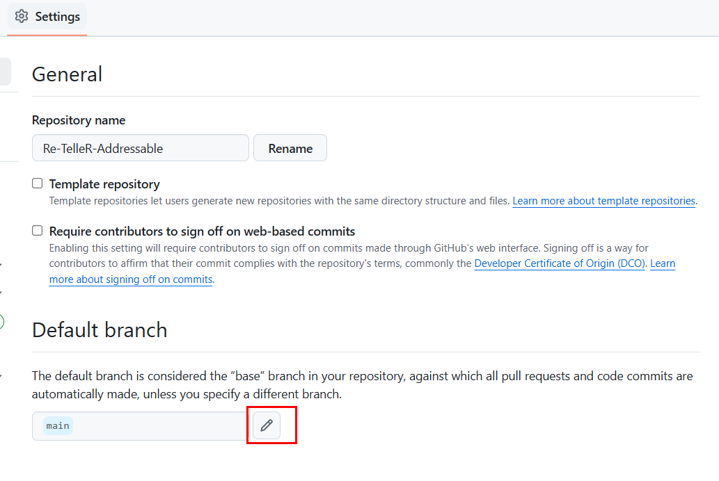 거기에 Default branch 부분에서 연필 아이콘 버튼을 눌러주시면 이름을 바꿀 수 있는 창이 뜹니다.
