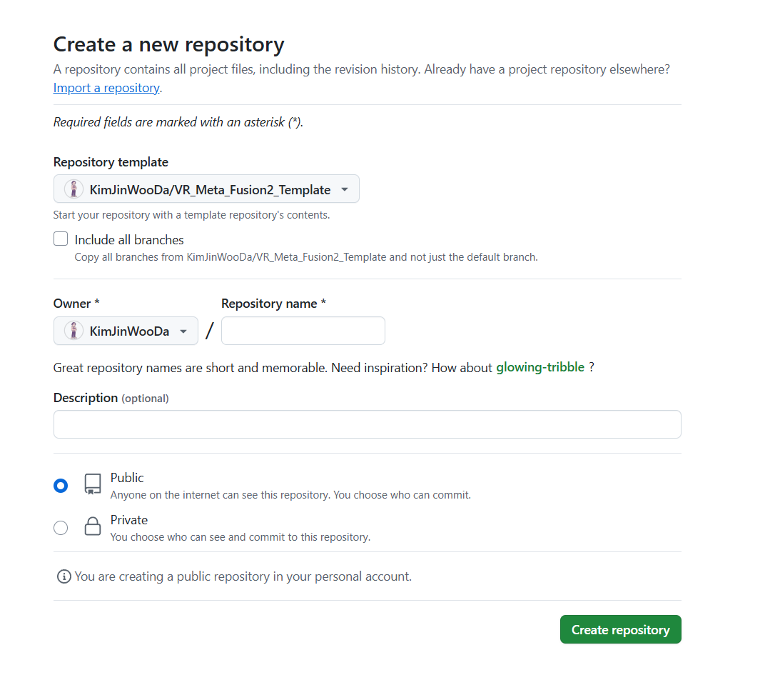 - 새로운 저장소 이름을 입력하고 Create repository클릭하여 프로젝트를 생성합니다.