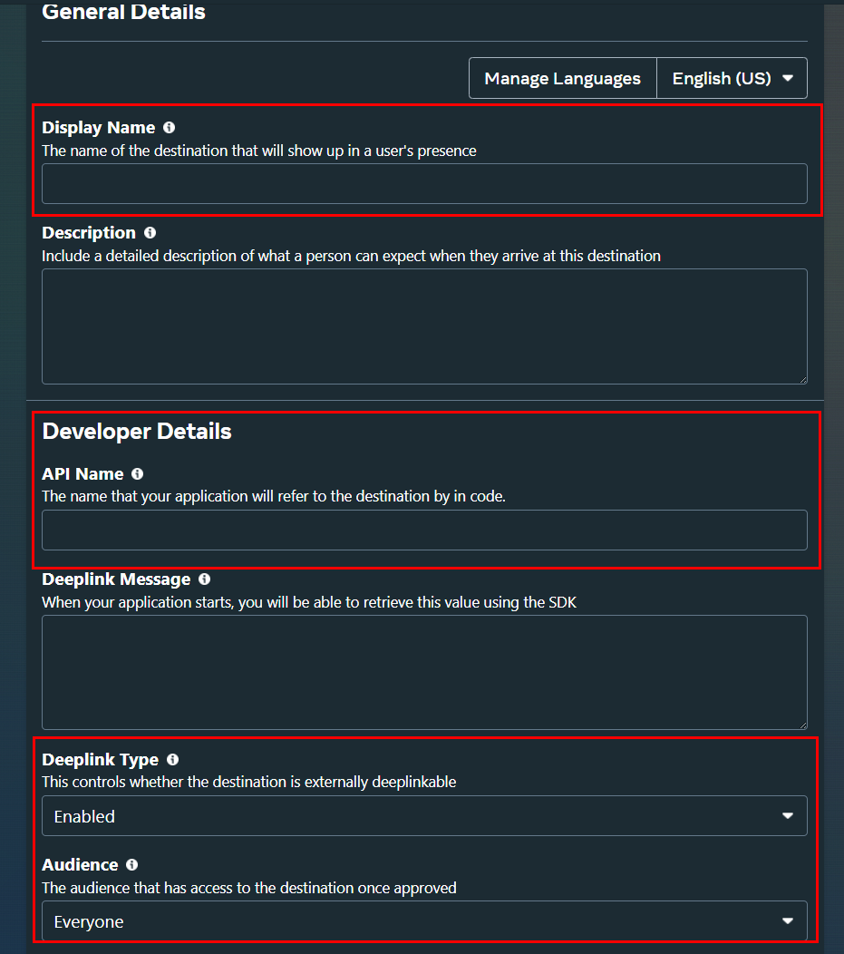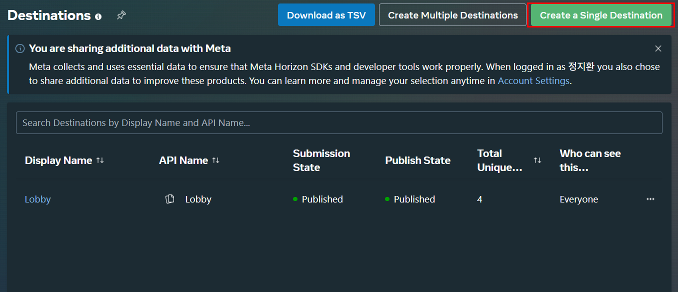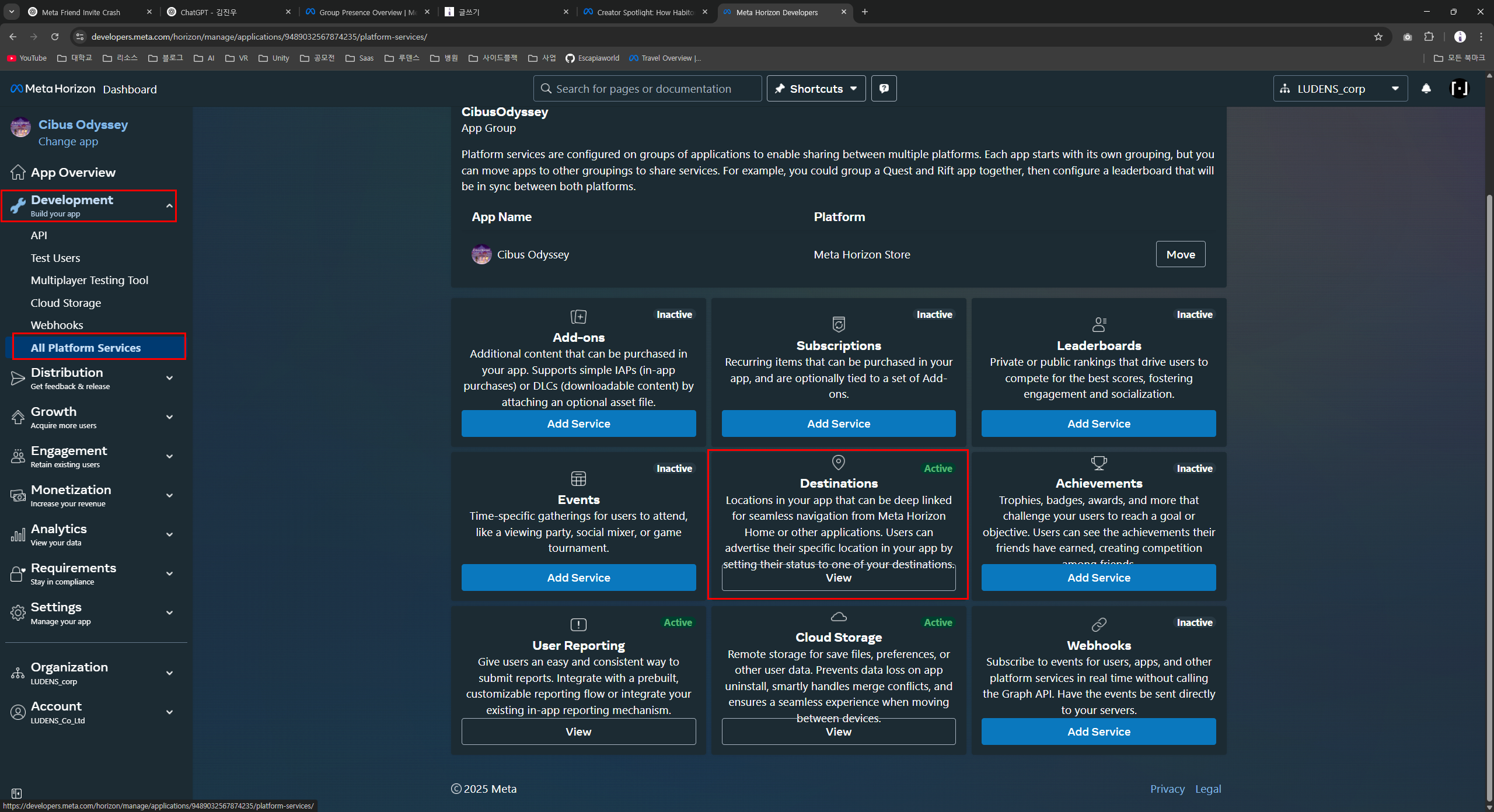 먼저, Group Presence와 App Link를 활성화하기 위해서는 Meta Horzion Dashboard에 가셔서, API Platform Service탭을 누른 후 Destinations을 선택(활성화)해줍니다.