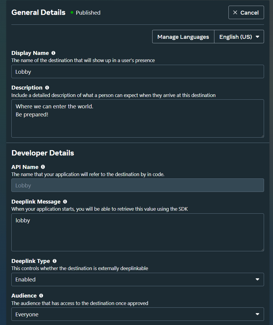 - DestinationApiName: Lobby, Map(동화나라) 같은 장소 키. VRChat의 월드 URL 같은 역할을 합니다.