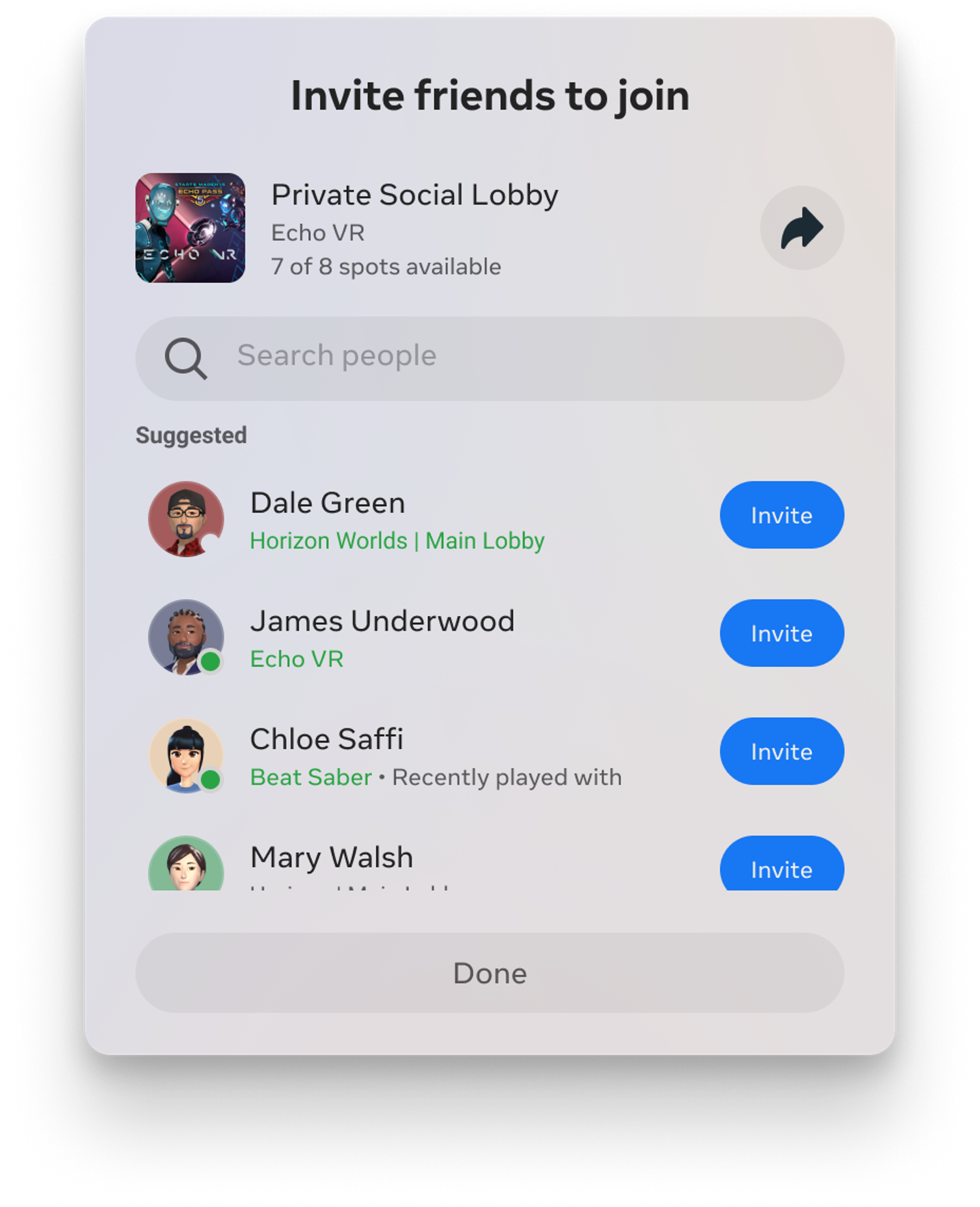 Group Presence와 App Link를 활용하면 위 영상처럼 초대를 받을 수 있고, 바로 친구가 들어가 있는 Room에 접속할 수 있습니다.