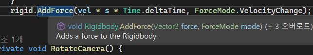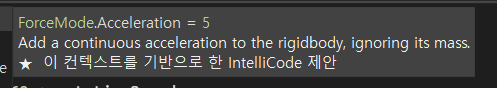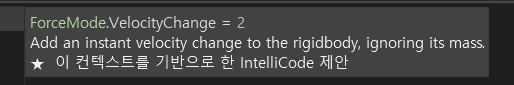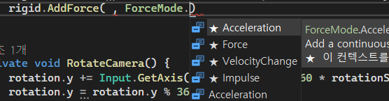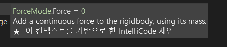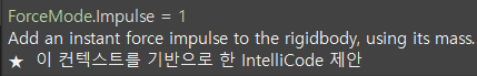 이 함수는 Rigidbody에 힘을 더해주는 함수인데 여기에는 더해줄 힘(여기에는 방향도 포함되어있다)과 힘을 어떻게 줄지 종류를 정하는 2개의 인자를 받습는다.