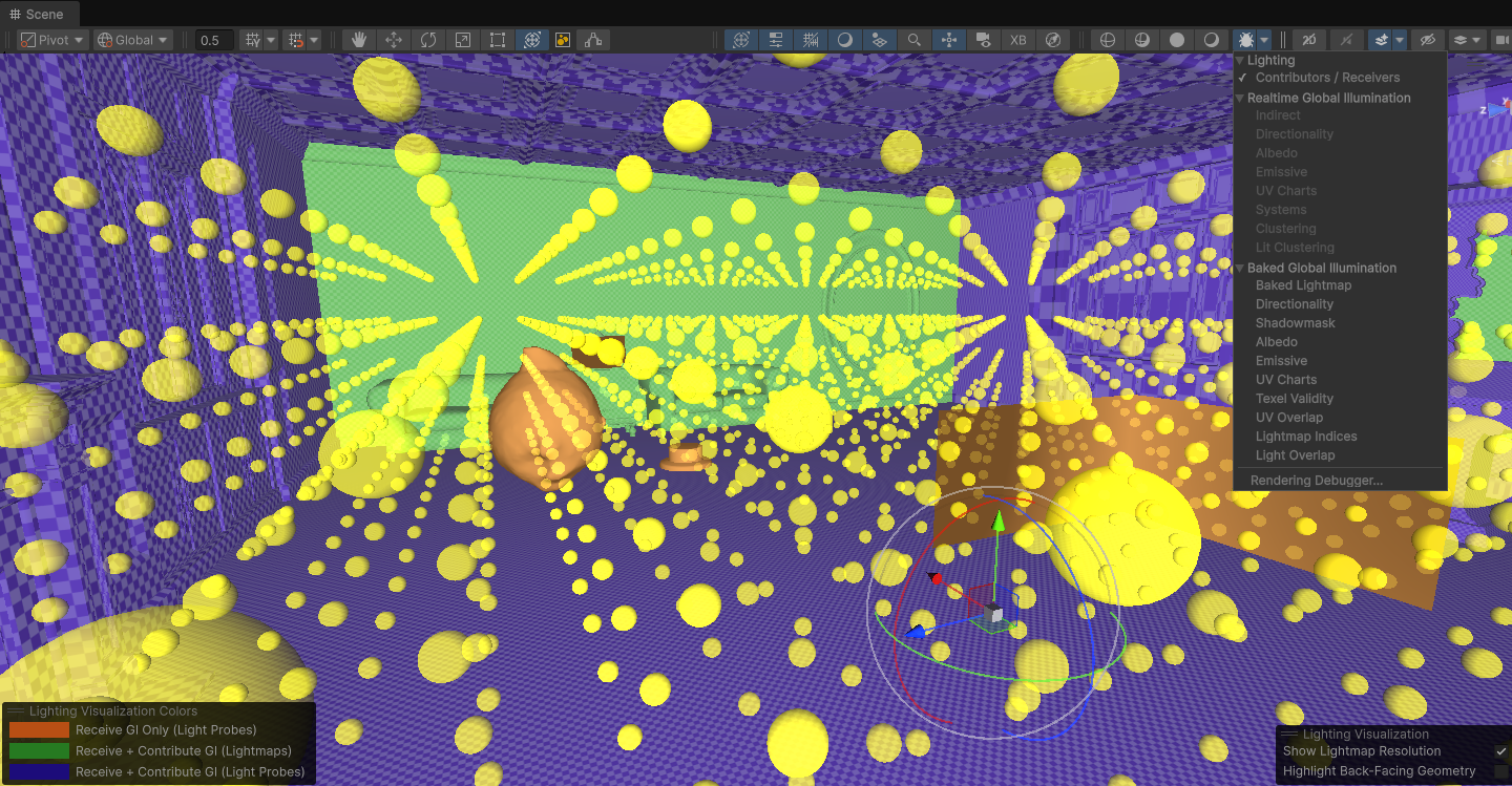 파란색은 라이트맵 + 라이트 프로브의 영향을 받는 객체란 뜻입니다.