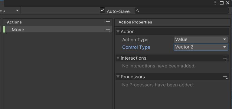 키보드로부터는 값을 받아오기 때문에 Value를 선택하고 X, Y축만 사용하기 때문에 Vector2를 선택한다.