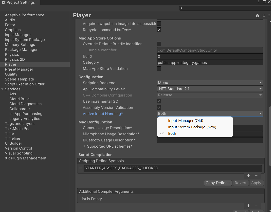 나는 Old버전의 인풋 시스템도 사용중이라 Both를 체크했다.
