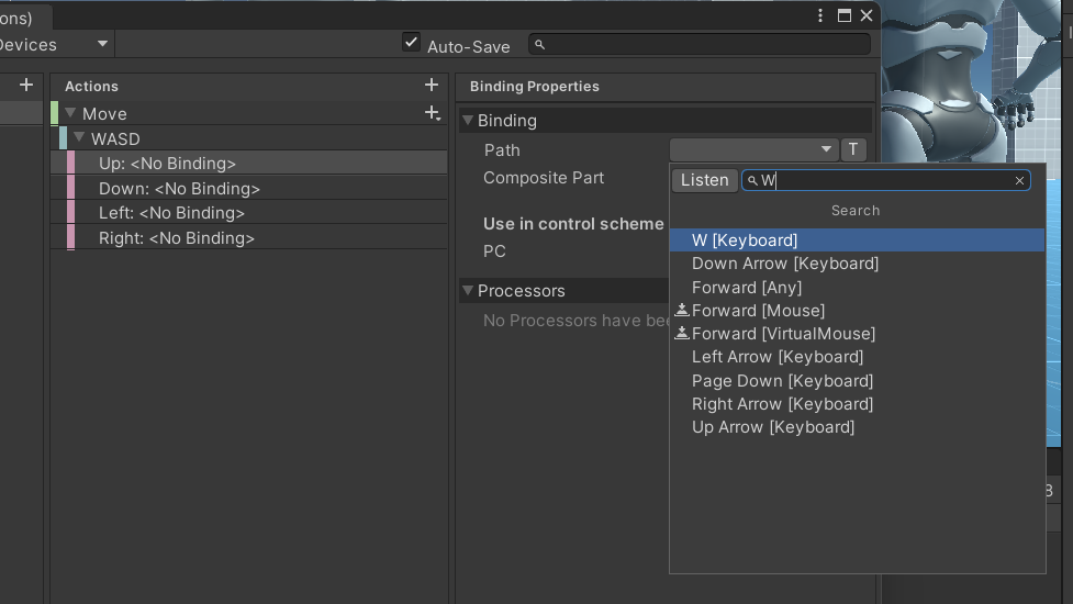 Up : <No Binding> 을 클릭하자.(노바인딩은 해당키에 대응되는 키를 아직 설정하지 않았다는 뜻이다)