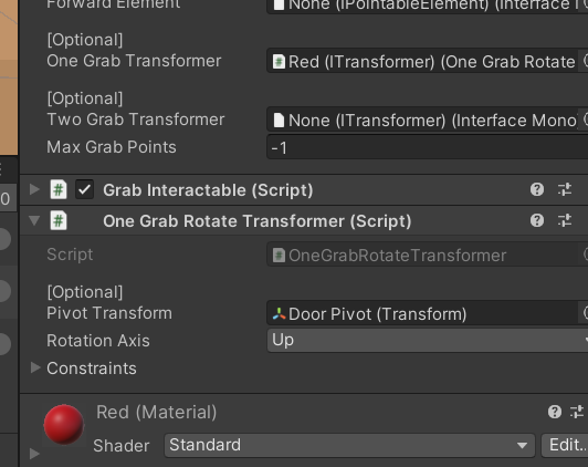 Door 오브젝트에 One Grab Rotate Transfomer컴포넌트와 Rigidbody를 만들어준다.