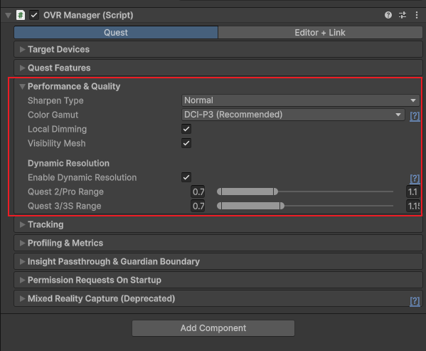 저의 경우 Open XR Plugin을 쓰면서 OVR Manager 테스트를 하고 있기에 이쪽에서 Dynamic Resolution 을 세팅해주고 있습니다.
