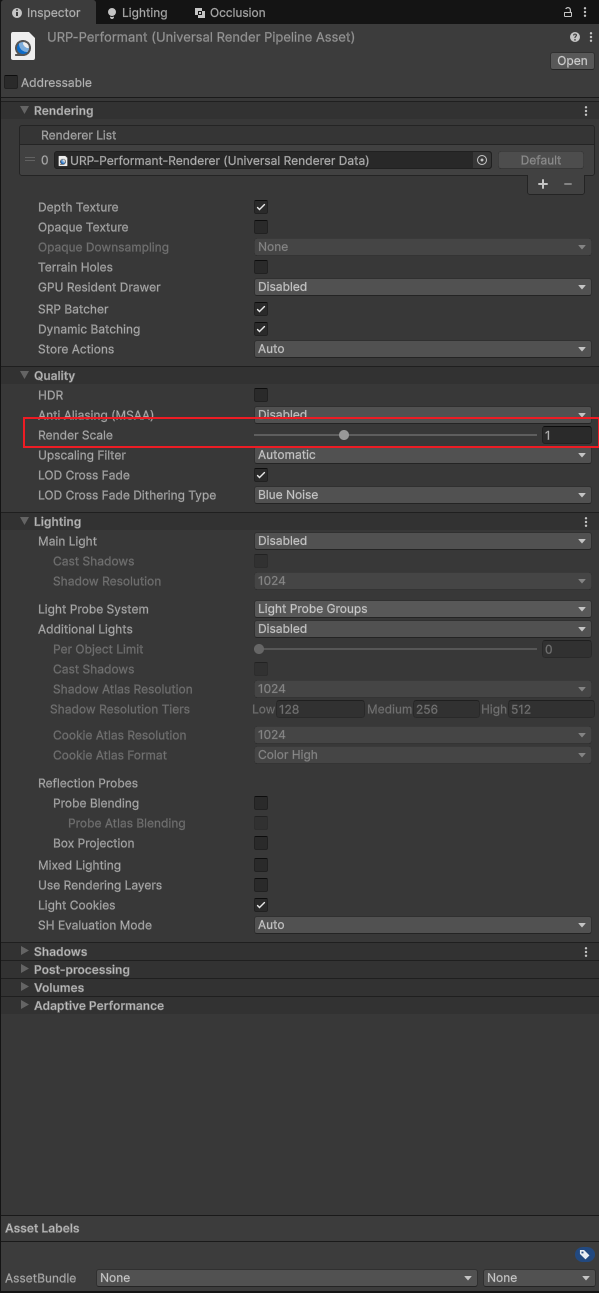 Render Scale은 URP Asset에서도 찾아보실 수 있습니다.