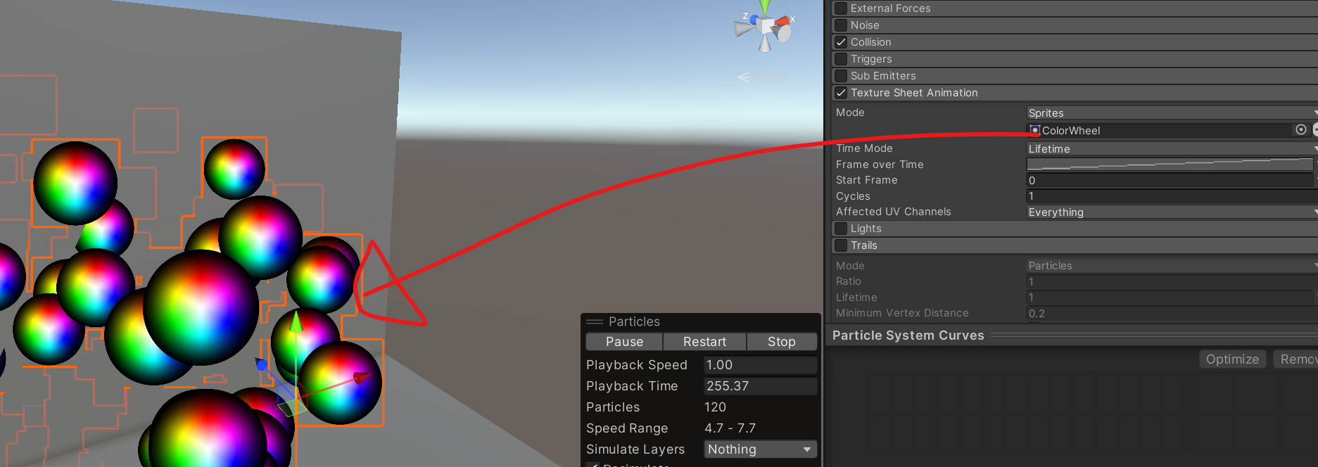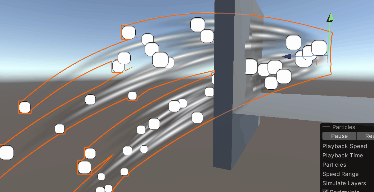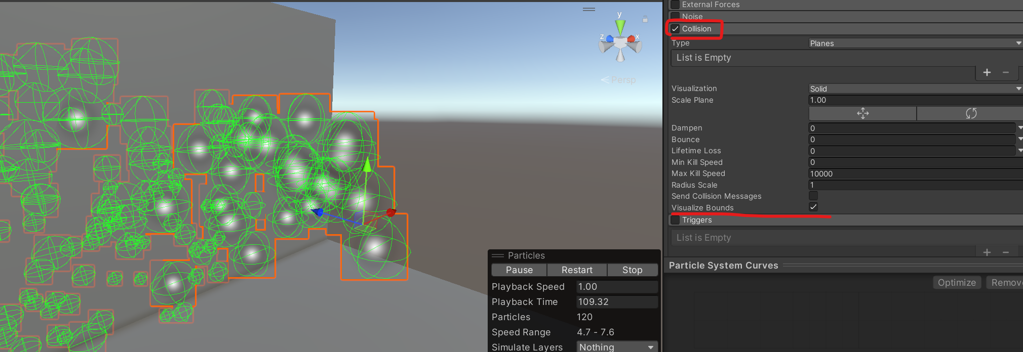 Visualize Bounds를 체크하면 Particle들의 콜라이더 범위가 보인다! 두둥!탁!