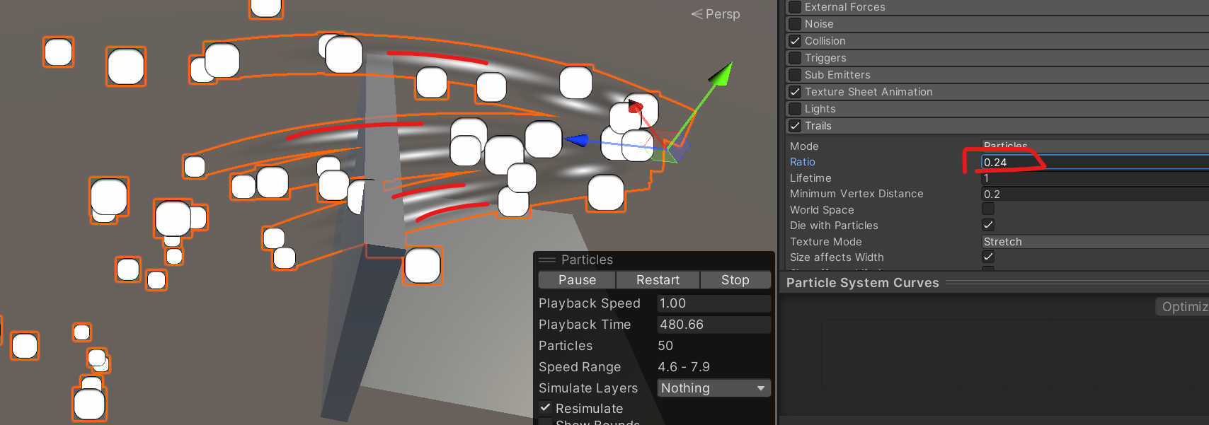 다음으로 Ratio는 0~1까지 있으며 1에 가까울수록 모든 Particle에 trail이 생기도록 하는 비율을 뜻한다