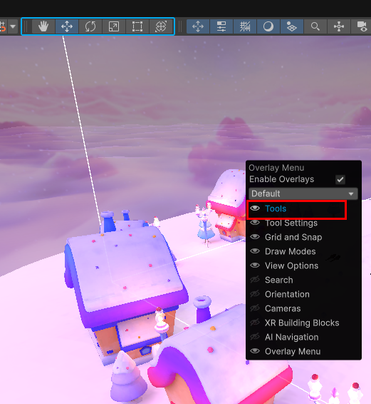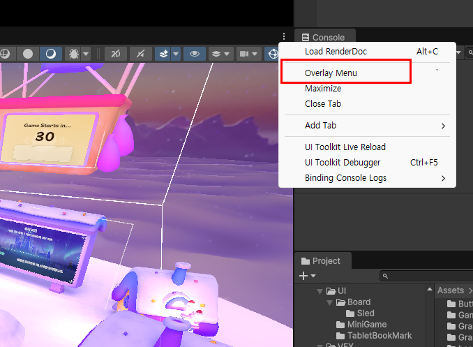 Scene 창에서 우측 점 3개를 누른 후 Overlay Menu를 클릭해줍니다.