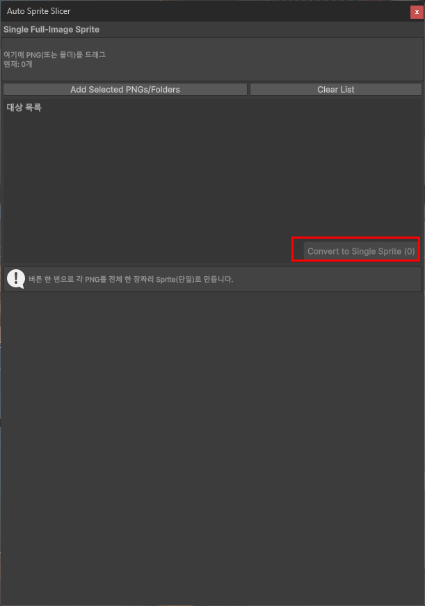 EditorGUILayout.HelpBox("버튼 한 번으로 각 PNG를 전체 한 장짜리 Sprite(단일)로 만듭니다.", MessageType.Info);
