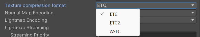 ETC, ETC2, ASTC 3개의 종류가 존재한다