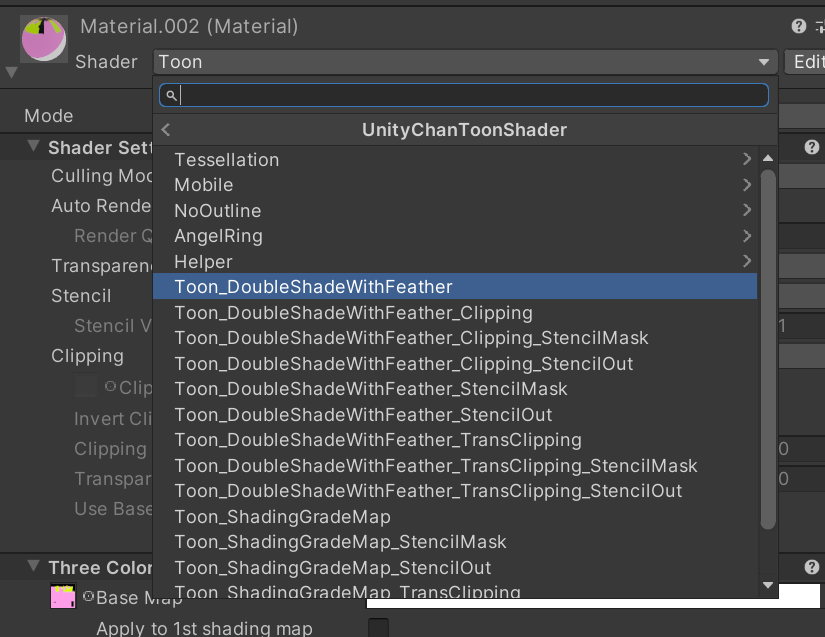 메테리얼을 눌러서 [Toon]- [UnityChanToonShader]항목에 있는 여러가지 툰 셰이더 중 하나를 선택해준다.