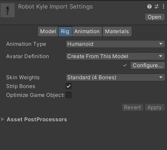 먼저 모델의 Animation Type을 Humanoid로 바꿔준다