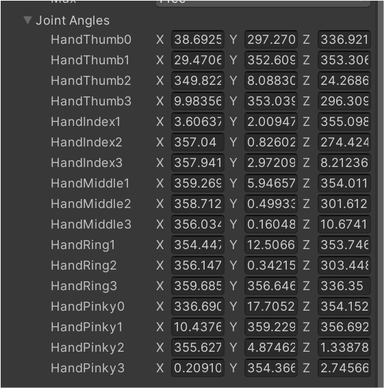 또한 Ghost Hand Pose는 사용자가 일일이 조작해서 원하는 손 모양을 만들 수 있으며 자세한 세부 수치는 Joint Angle을 통해 세팅할 수 있습니다!