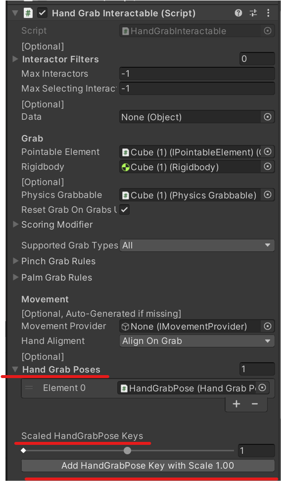 Hand Grab Pose 오브젝트에는 Hand Grab Pose 컴포넌트가 주어지며