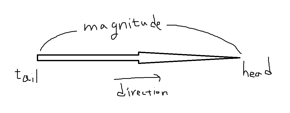 위 사진에서 tail을 시작점, head가 끝나는 부분을 종점이라고 부르며, 이 둘의 사이의 거리가 벡터의 크기가 된다