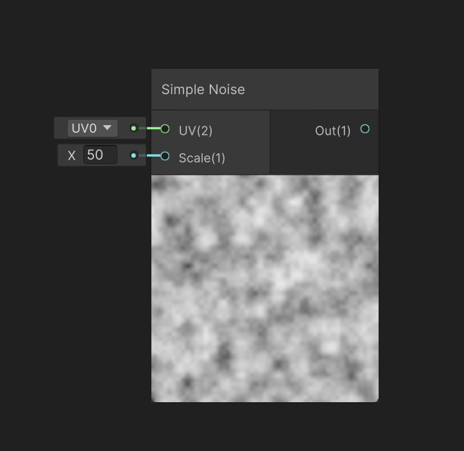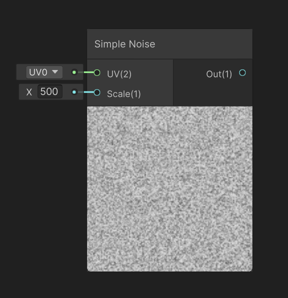 Generates a simple, or Value, noise based on input UV. The scale of the generated noise is controlled by input Scale.