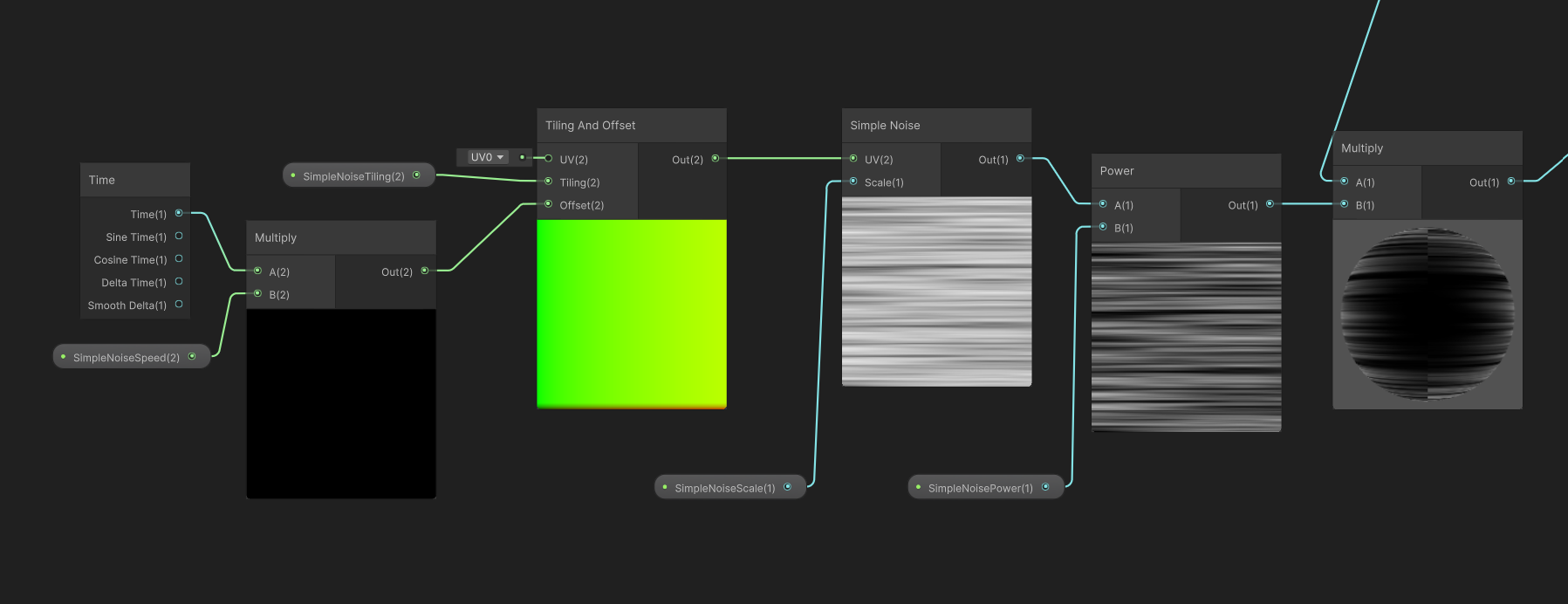 Time과 Mulitply를 이용해 offset에 넣어줬고 Tiling의 값은 임의로 줬다! 그럼 Time에 따라 Simple Noise값이 변하겠죠?