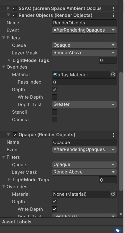 새로운 Render Objects를 만들어줍시다! Filters에 Layer Mask를 해당 레이어로 맞게 바꿔주고 Override를 눌러 해당 메테리얼을 할당해주고 Depth를 클릭하고 Write Depth를 꺼줍니다! 그리고 Depth Test를 Greater로 바꿔줍니다! 여기까지는 가려지는 쪽에서의 설정이고
