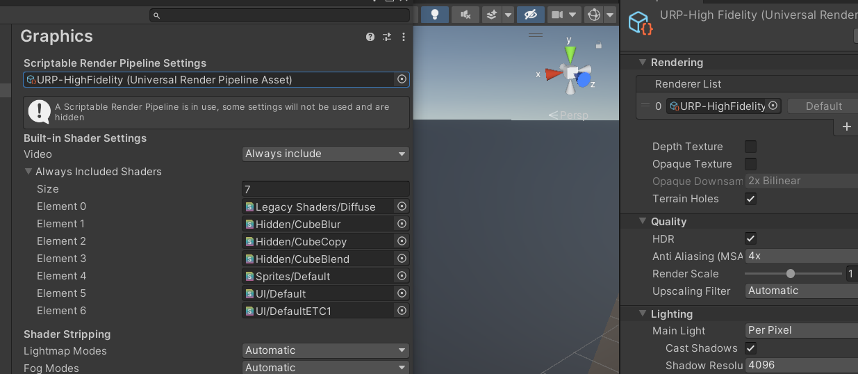 그다음 프로젝트 세팅 -> 그래픽에 들어가면 해당 URP가 보이는데 더블클릭하면 오른쪽 하이러키창에 저렇게 뜨고 Renderer List에 있는 거를 더블클릭합니다!