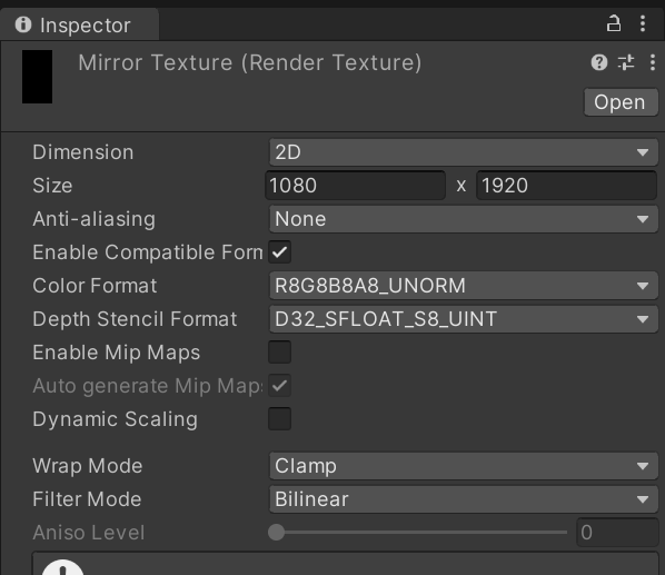 Render Texture을 만들면 Dimension, Size, Anti-aliasing, Enable Compatible Format, Color Format, Depth Stencil Format, Enable Mip Maps, Dynamic Scaling, Wrap Mode, Filter Mode가 존재하는 것을 확인할 수 있습니다. 이것들에 대해 간단