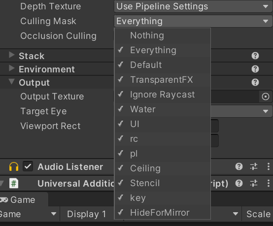 이때, 카메라가 오브젝트에 가려진다면 카메라의 Culling Mask를 설정해 주면 됩니다.