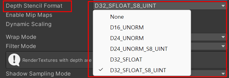 Render Texture을 만들면 Dimension, Size, Anti-aliasing, Enable Compatible Format, Color Format, Depth Stencil Format, Enable Mip Maps, Dynamic Scaling, Wrap Mode, Filter Mode가 존재하는 것을 확인할 수 있습니다.