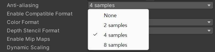 Dynamic Scaling : 다이내믹 해상도 스케일링을 통해 렌더 텍스처의 크기를 조절하려면 토글을 선택합니다. 이 옵션을 활성화하지 않으면 렌더 텍스처가 다이내믹 해상도 설정과 상관없이 같은 크기로 유지됩니다.