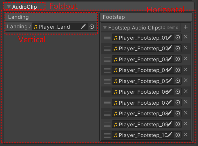 [BoxGroup("AudioClip/Horizontal/Right/Footstep")] public AudioClip[] FootstepAudioClips;